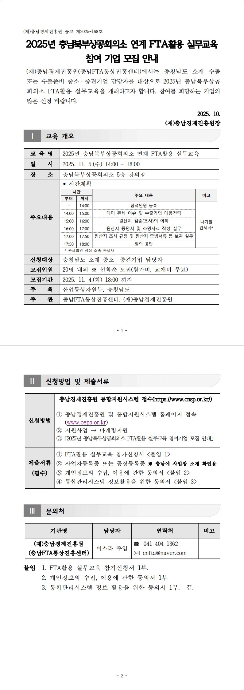 2025년 충남북부상공회의소 연계 FTA활용 실무교육 참가기업 모집